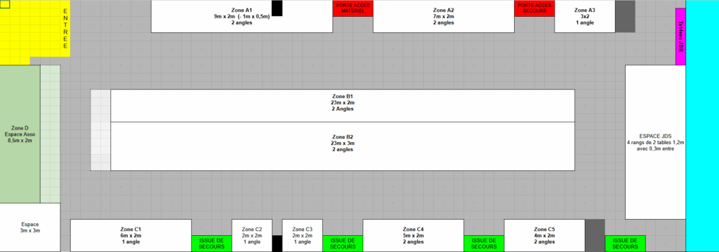 Pour cette cinquième édition et pour répondre à une demande exprimée par plusieurs exposants, nous vous proposons de nous indiquer vos préférence pour l’installation de votre stand : indiquer dans l’ordre de priorité les 3 zones sur lesquelles vous souhaitez être positionné à partir de ce plan :