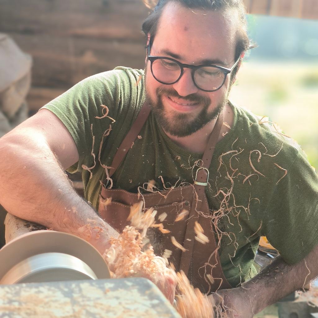 Guillaume travaille le bois comme on honore une matière sacrée. Chaque veine, chaque nœud, chaque courbe guide le geste. Le tournage devient presque un rituel : la matière brute prend forme, se creuse, s’arrondit, se révèle.